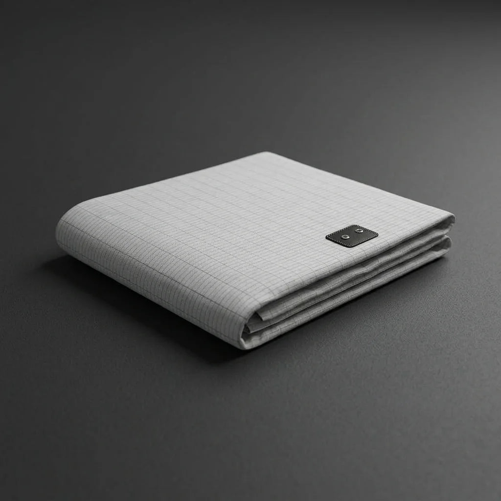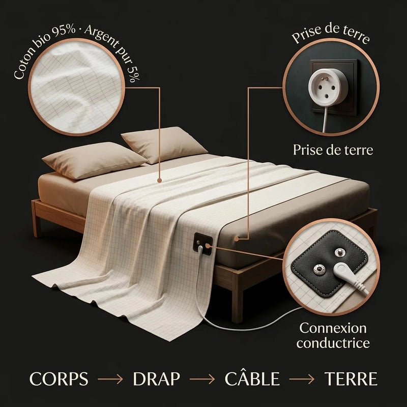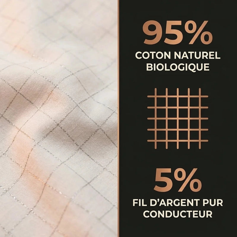 Coton biologique certifié tissé avec des fils d'argent pur (5%). La sensation est celle d'un drap en coton premium — doux, respirant, agréable sur la peau. L'argent est invisible au toucher mais crée le réseau conducteur nécessaire à la mise à la terre. Testé dermatologiquement — adapté aux peaux sensibles, y compris les enfants.