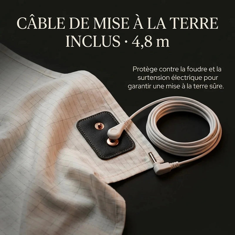 Aucun courant électrique ne circule. La prise de terre est un circuit passif — il ne transporte que les charges statiques, pas l'électricité de votre réseau. C'est exactement comme marcher pieds nus dans l'herbe. Naturel, passif, sans risque. Conforme aux normes européennes de sécurité.
